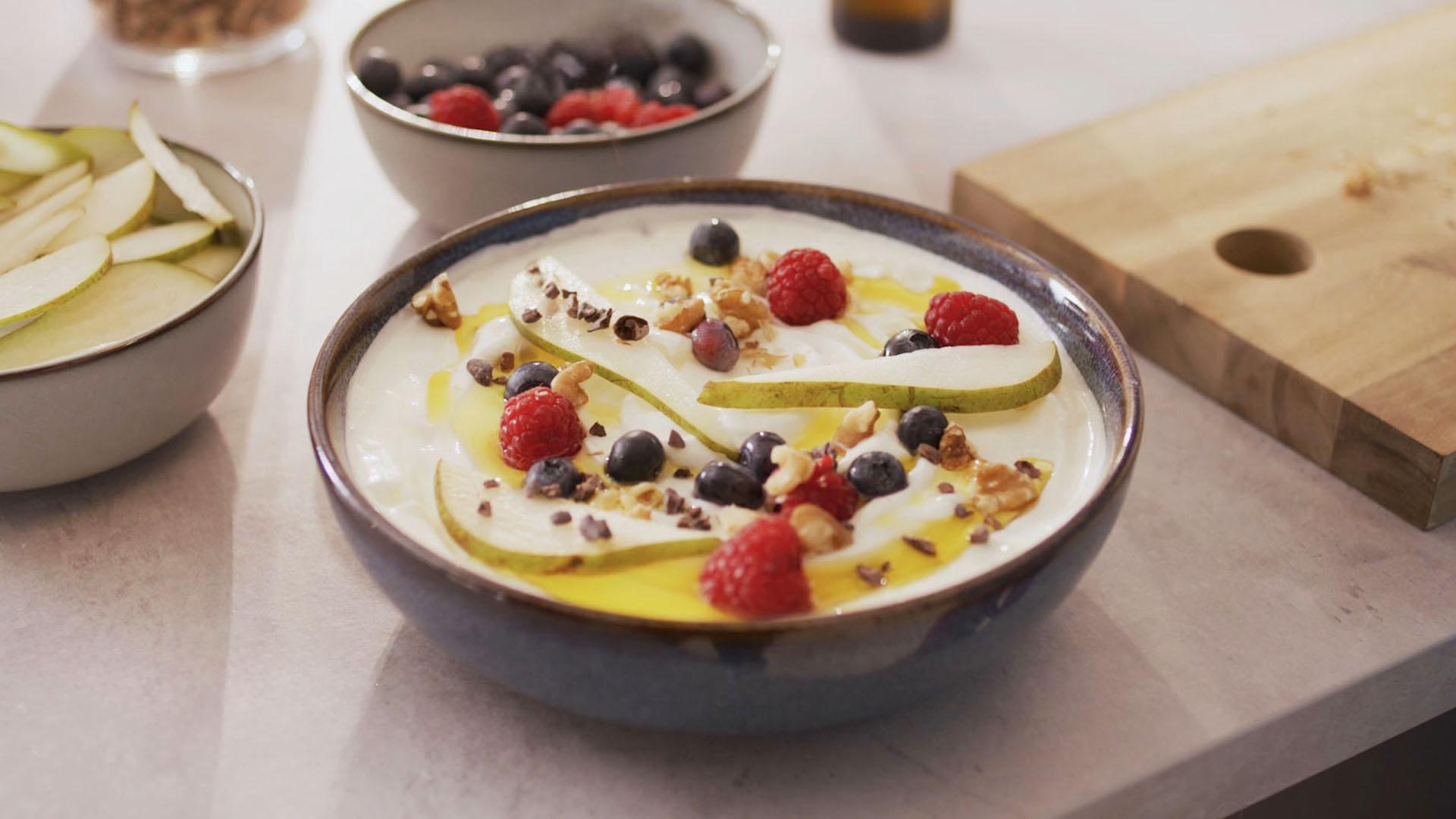 Beispiel-Topping bei Abnehmwunsch (pro Person): ½ Birne, 50 g Himbeeren, 50 g Heidelbeeren und 2 Feigen in Spalten.