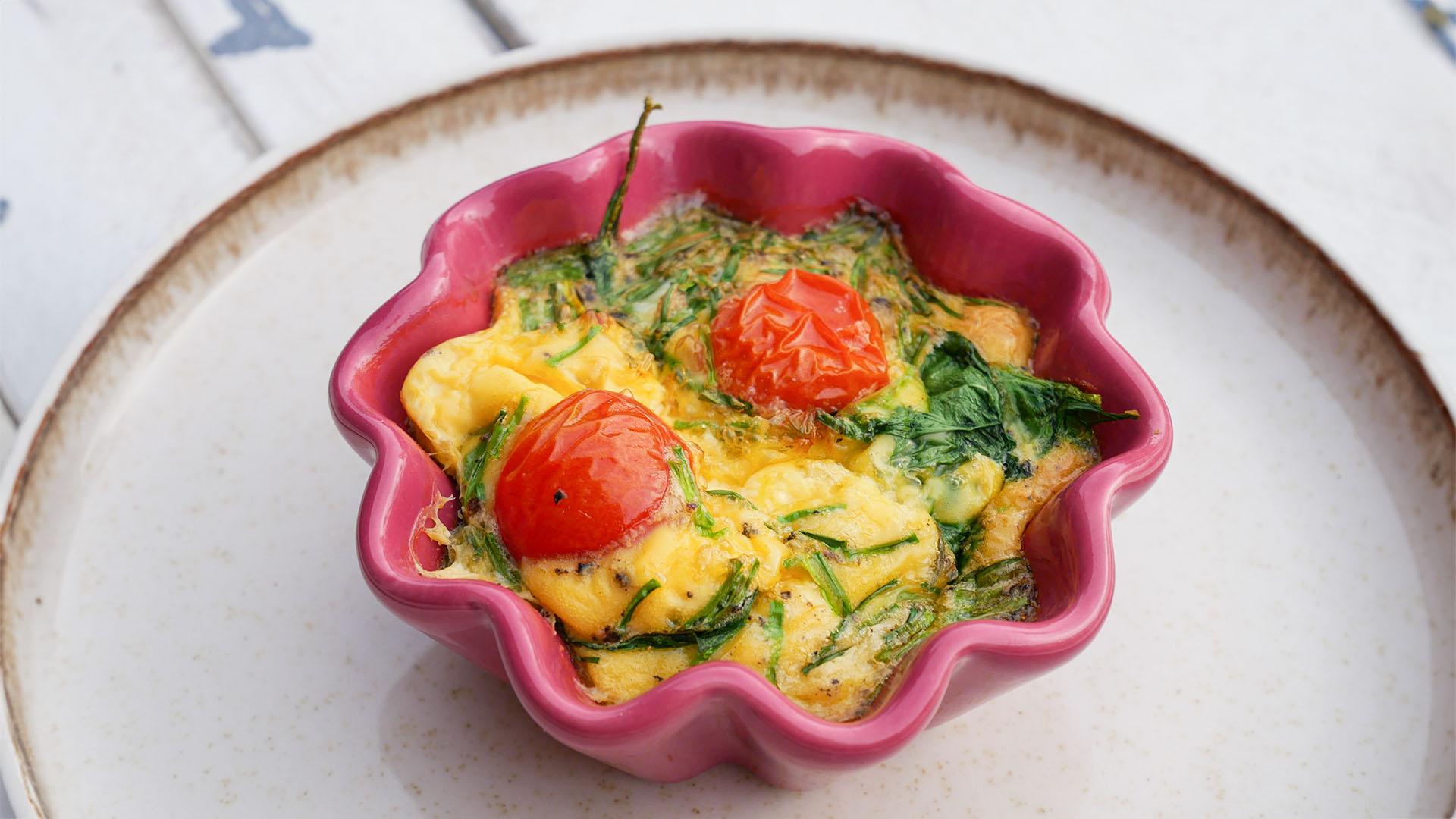 Feta zerbröseln. Mit Spinat und Tomaten in die gut gefetteten Mulden eines 12er-Muffinblechs verteilen. Eiermasse darauf gießen. Im vorgeheizten Backofen (E-Herd: 200 °C, Umluft: 180 °C, Gas: Stufe 3) 10-12 Minuten backen. Kurz abkühlen lassen und aus den Mulden lösen.