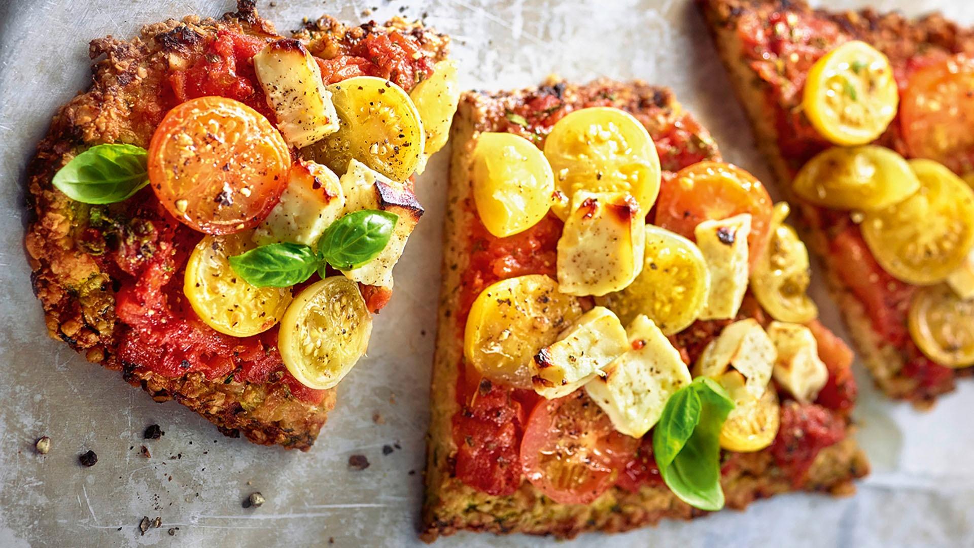 Die Zucchinipizzaböden herausnehmen (den Backofen nicht ausschalten) und die Bodenränder mit etwas Olivenöl einstreichen. Das abgetropfte Tomatenfruchtfleisch in eine Schüssel geben, Kräuter, Salz und Pfeffer zugeben und verrühren. Die Mischung gleichmäßig auf den Böden verteilen. Feta und Tomatenhälften mit den Schnittflächen nach oben darauf verteilen und weitere 8–10 Minuten im Backofen backen.