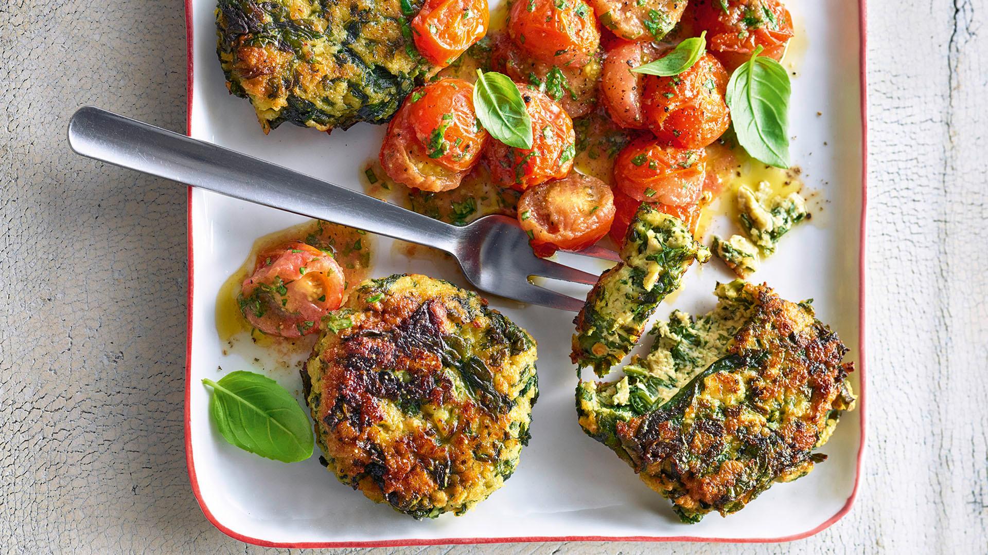 Die Plätzchen mit den Tomaten auf zwei Tellern anrichten. Das gehackte Basilikum über die Tomaten streuen und mit den ganzen Basilikumblättern garnieren.